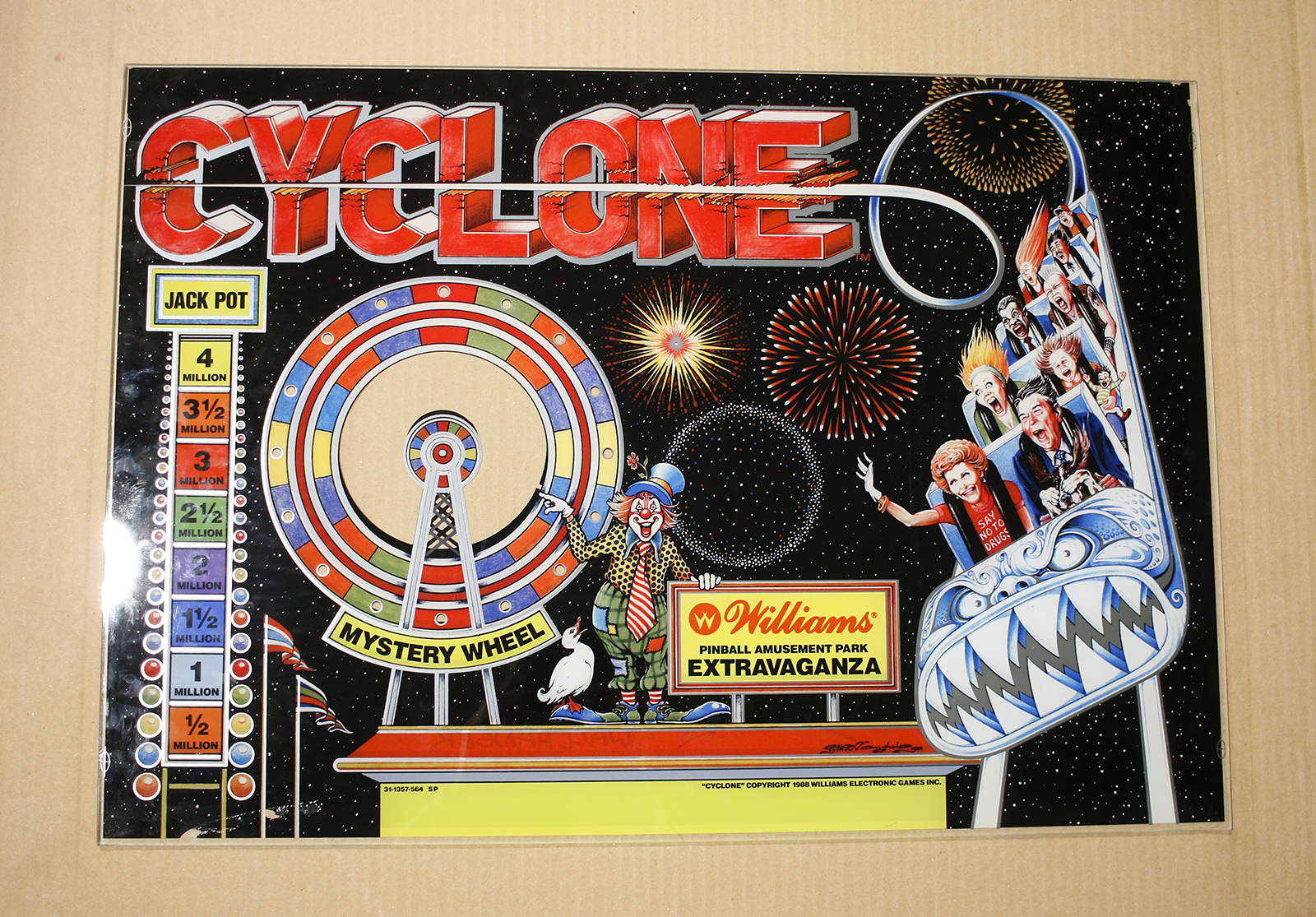 This is a Cyclone repro backglass done for initial test / color checks. It’s missing rear layers, and was a failed partial print of the total stack, has markups on the backside for rejection. Front layers, including mirroring, are all there. It does suffer from a ding (see gallery closeup). Being sold with intentions for a wall hanger only. Priced to clear.