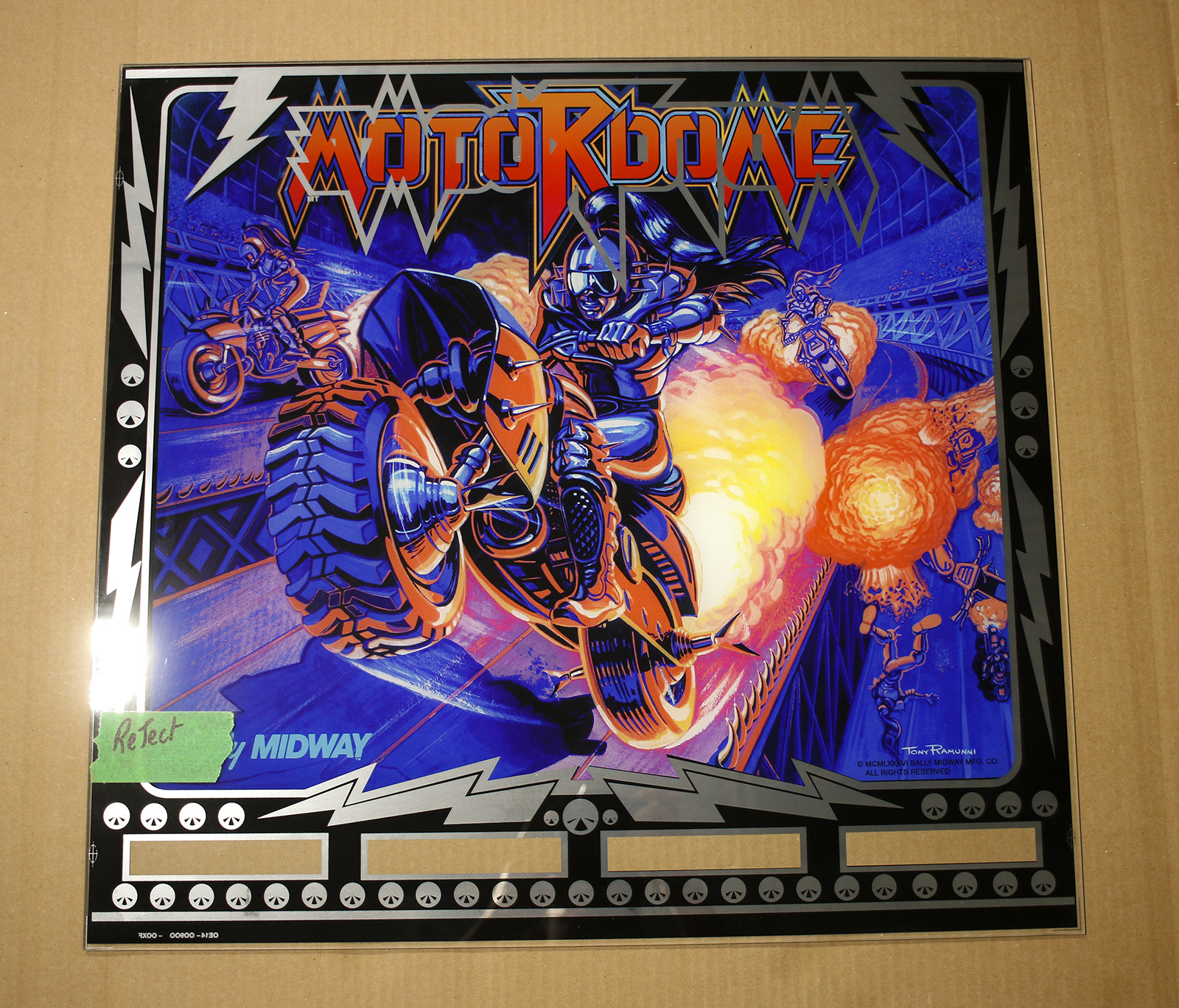 This is a Motordome backglass that suffered a reversal error on the mirror layer. It freaks out the look of the title, but worked out lining up to the features on the bottom and everywhere else! Great for a bizarre gameroom wall hanger / conversation piece