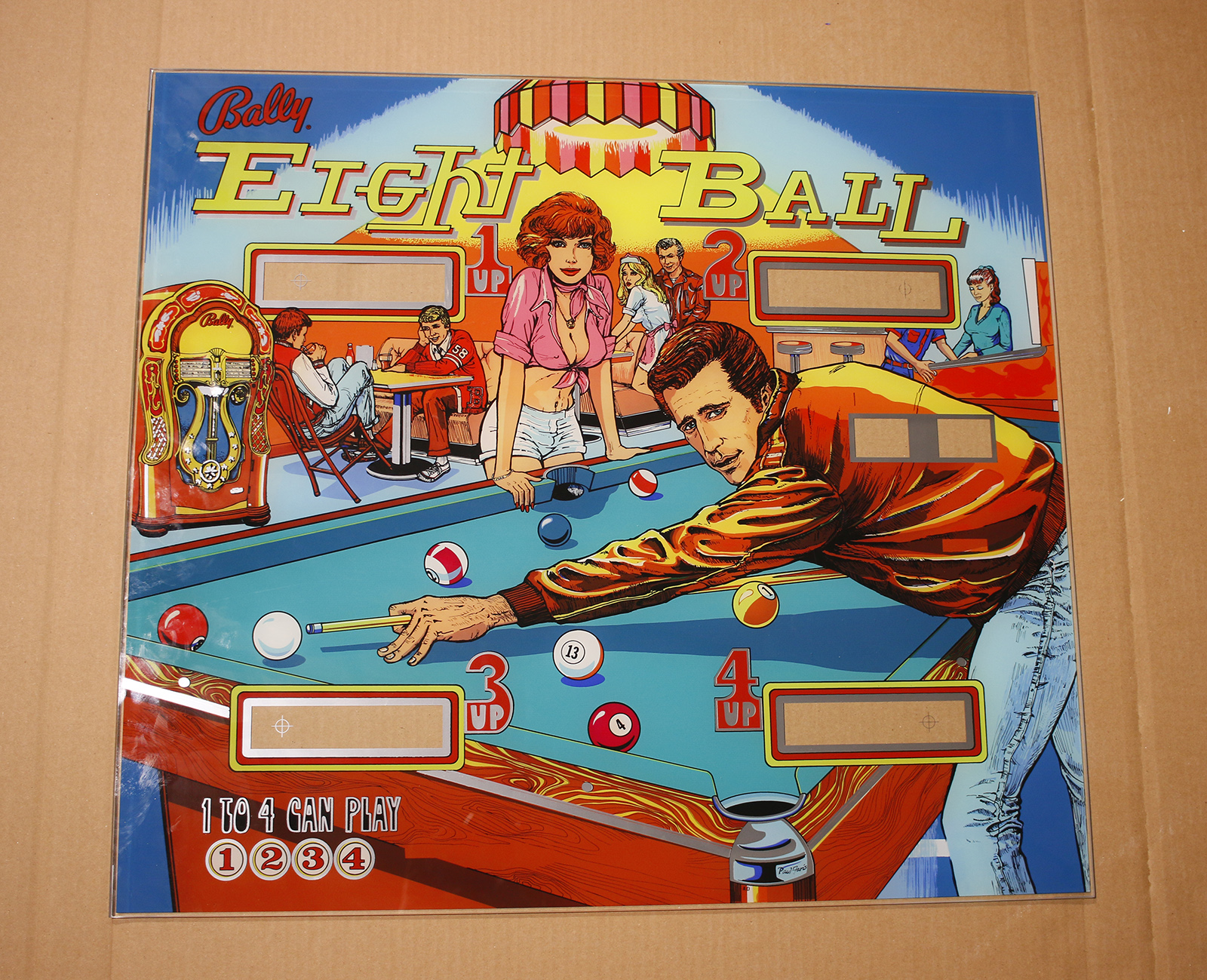 This is an Eight Ball mirrored backglass rejected due to a partially failed sub-layer printing. It looks great from the front, but will not look correct when backlit. Wall hanger.
