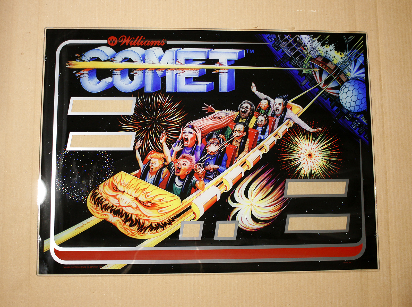 This is a Comet backglass that was rejected due to streaking of the mirror layer, prior to all the other artwork layers being added later. If inspected closely, mild streaks of silver can be noticed – usually only visible over black. See gallery closeups. Could be used to save a game on a budget, but being sold with the intention of wall hanger. Priced to clear.