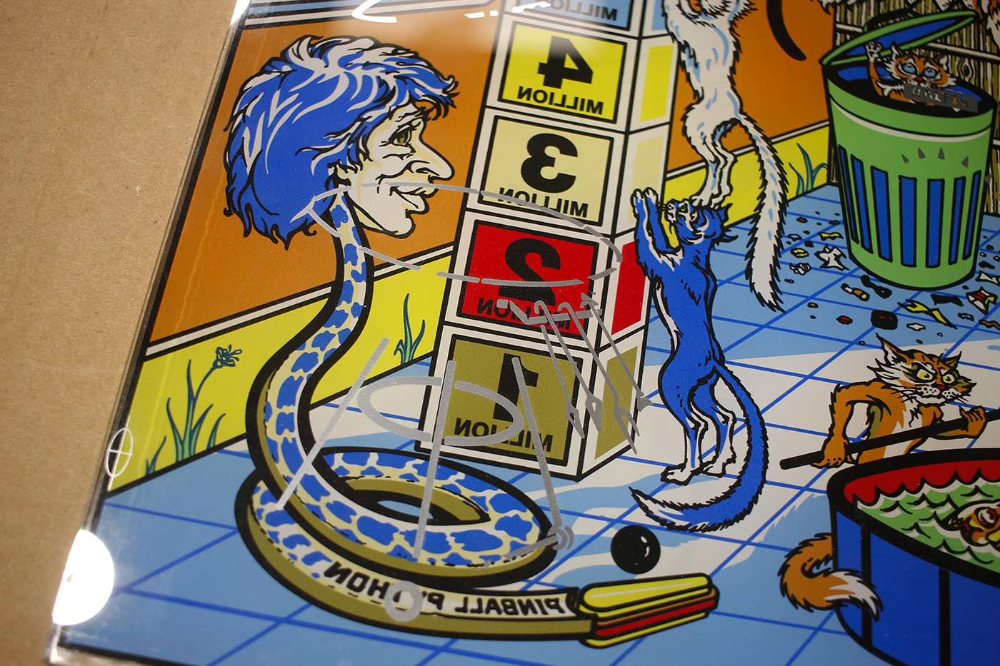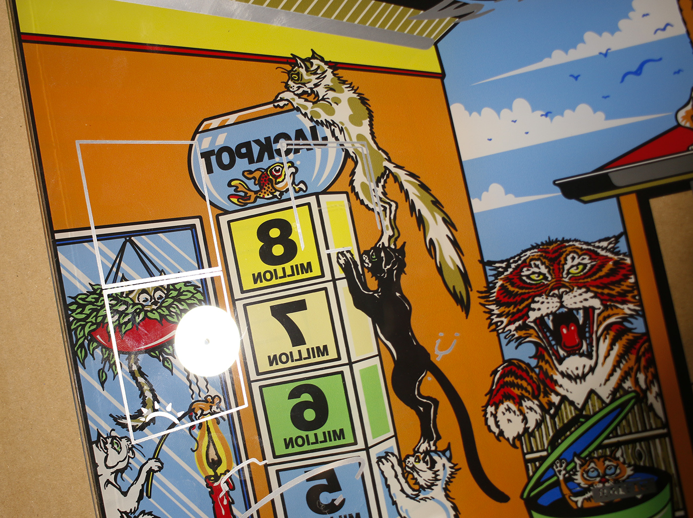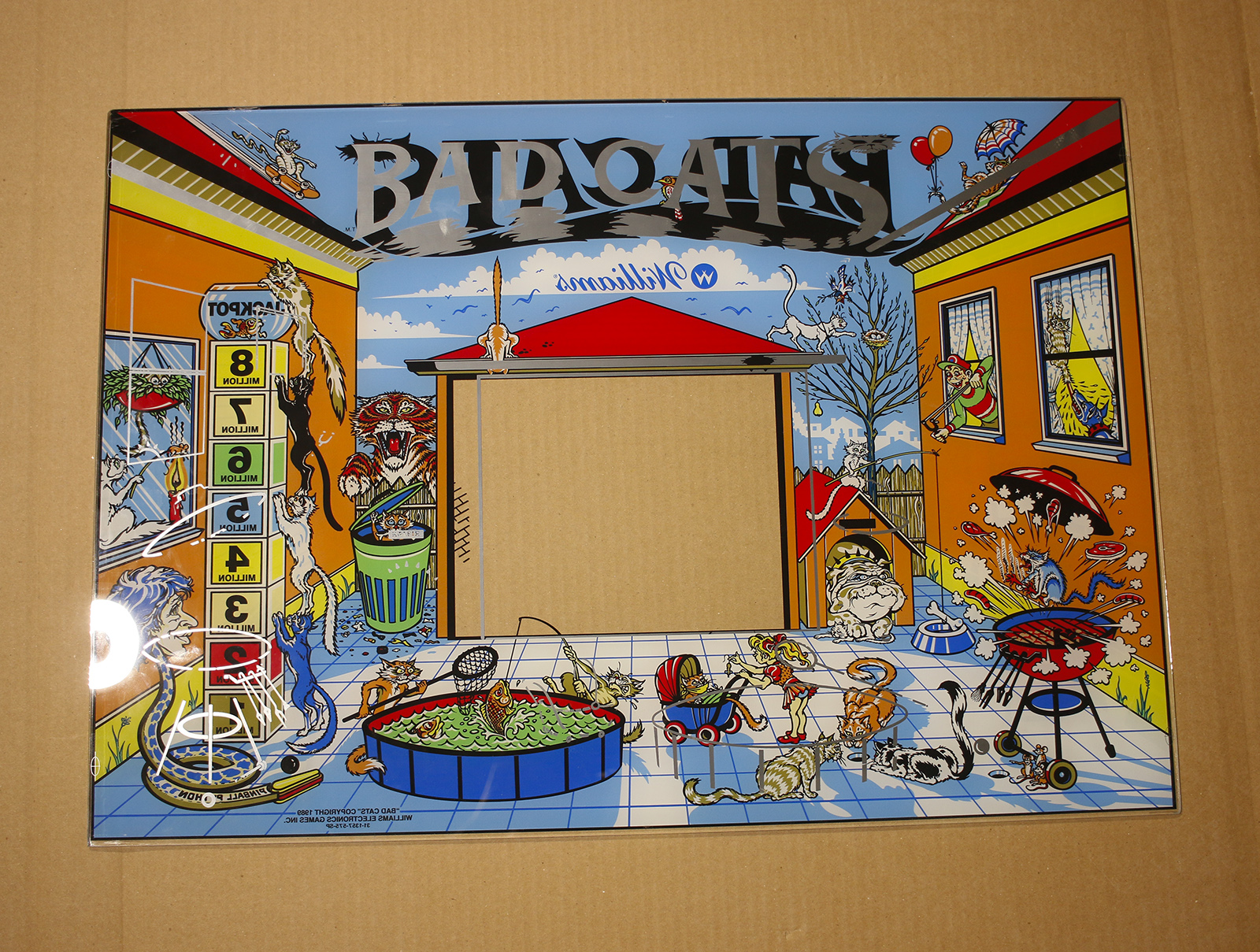 This is a bizarre Bad Cats backglass misprint. Some of the rear layers messed up, where the color artwork got reversed, while the mirroring was correct. We held onto it as a wall hanger in the shop. An inside joke of shame for a laugh. Consider it a weird one-of-a-kind for a Bad Cats or Python fan. An LSD trip on glass, haha. We don’t want to move it to the new facility – so offering it up here.