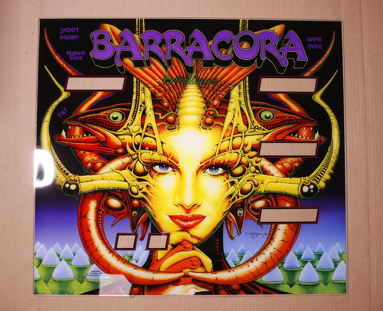 This is a Barracora repro backglass, a cool find from storage, one of the SILKSCREENED reproductions from back around 2013 or 2014. It suffers from mottled purple in the logo, and some scrapes on the bottom edge. See gallery closeups. Intended as a wall hanger, but could be used in a machine as a decent (and rare) glass on a budget ! Priced to clear.