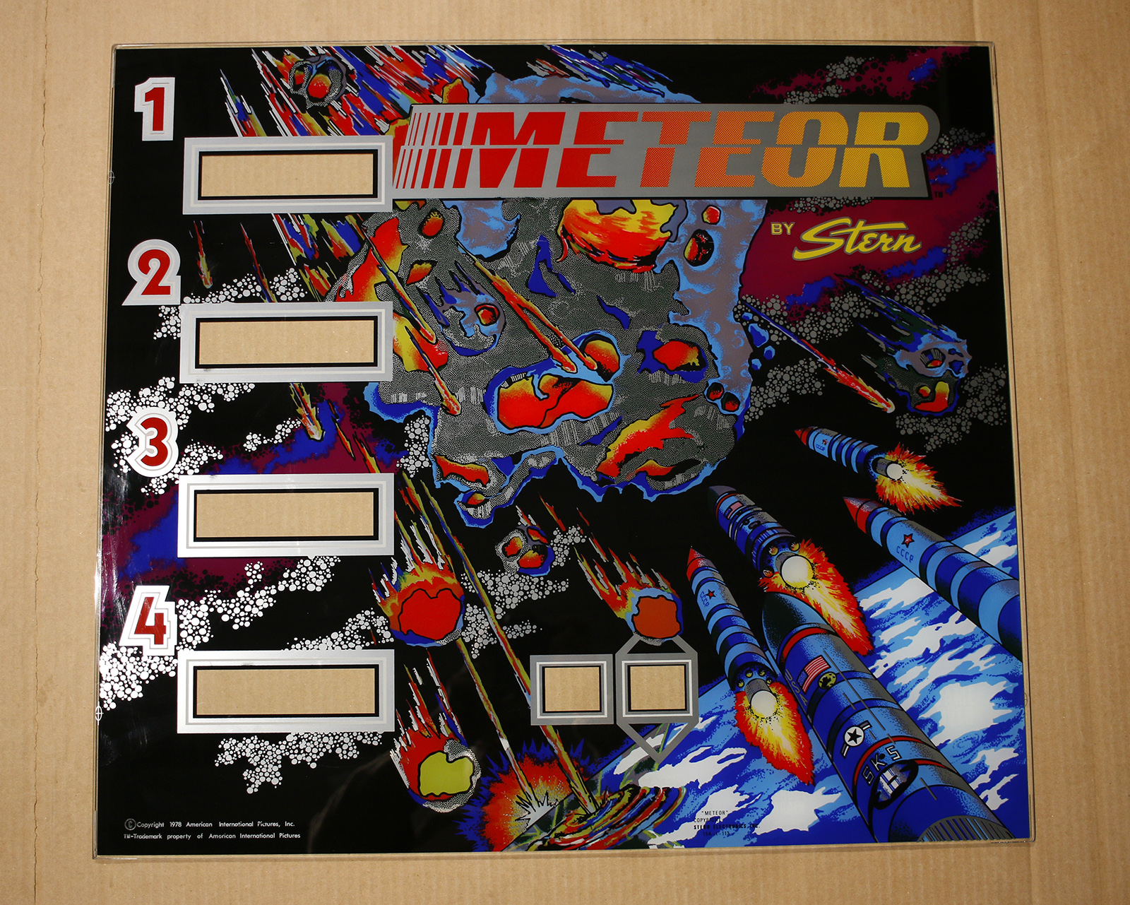 This is a Meteor backglass that has a few little blemishes in the mirror layer around the score windows. See gallery closeups. The rest of the glass is fine. Will certainly save a game on a budget.