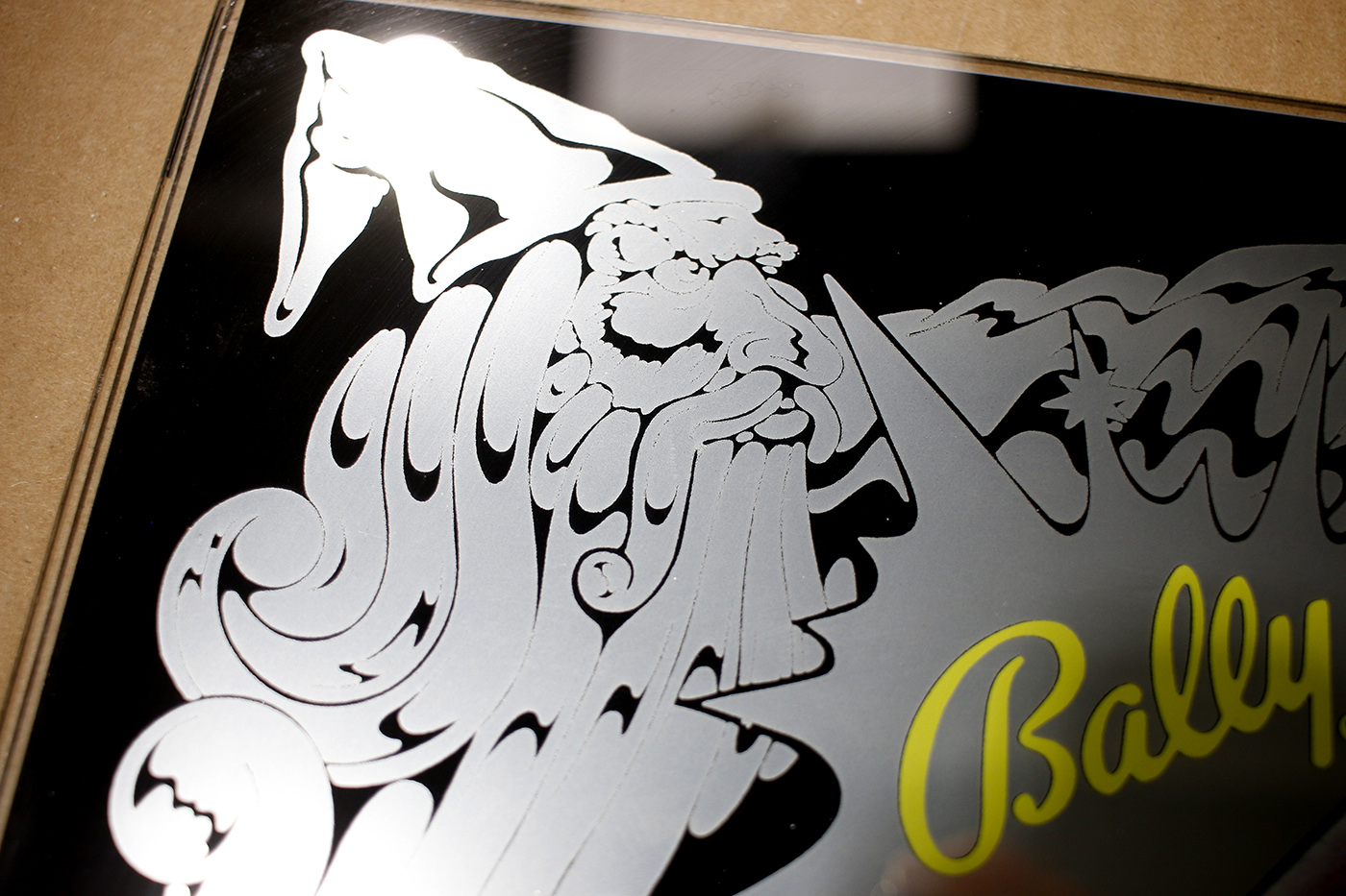 This is a Silverball Mania repro backglass that was rejected many years ago, finally coming out of storage. It has two caveats: 1) there are some scrapes/damage as pictured in the photo gallery 2) the mirror layer was too “gainy” in the upper left, meaning the silkscreen ink smooshed outward when printed, closing up several edges. Beyond that, would make a great wall hanger. Priced to clear.