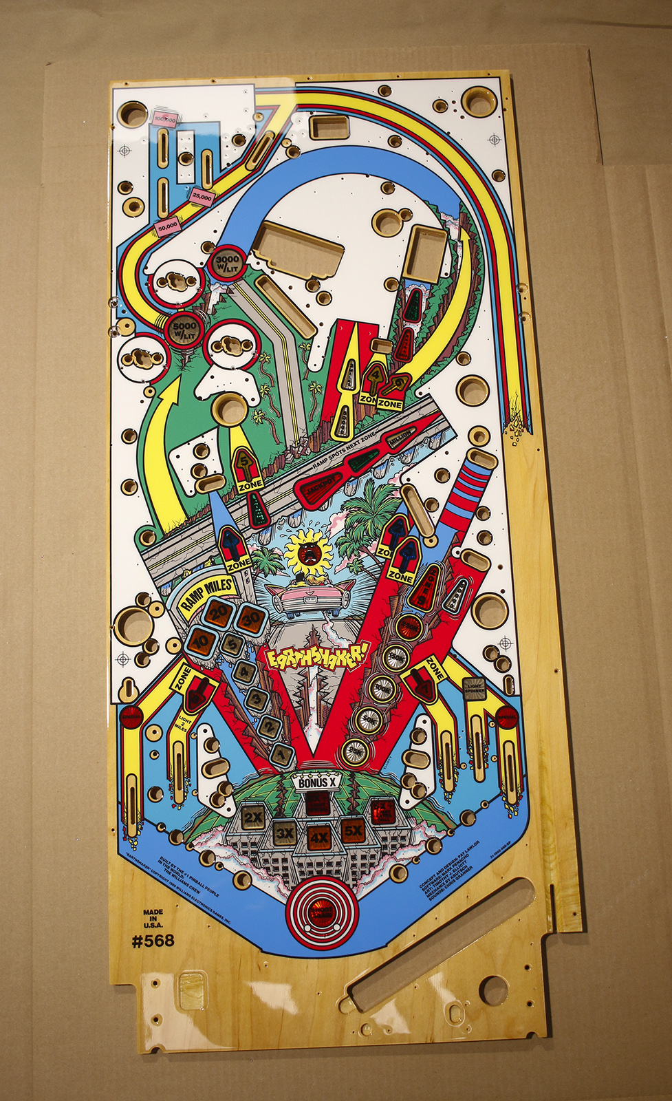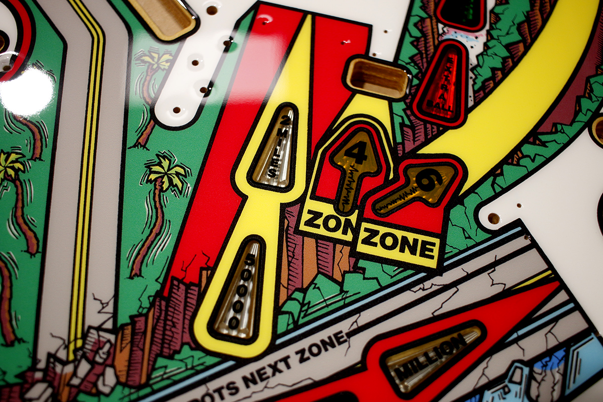 This is an Earthshaker playfield that ended up getting a botched print (wrong density settings in the layers). The artwork is all there, but the color densities are a tad “pale”. Black didn’t go down double-thickness, so it’s also slightly weak. See pictures for closeup examples. For somebody saving a desperate game, this could be a swap on the cheap. But we consider this a wall hanger – which is what it was here in the shop.