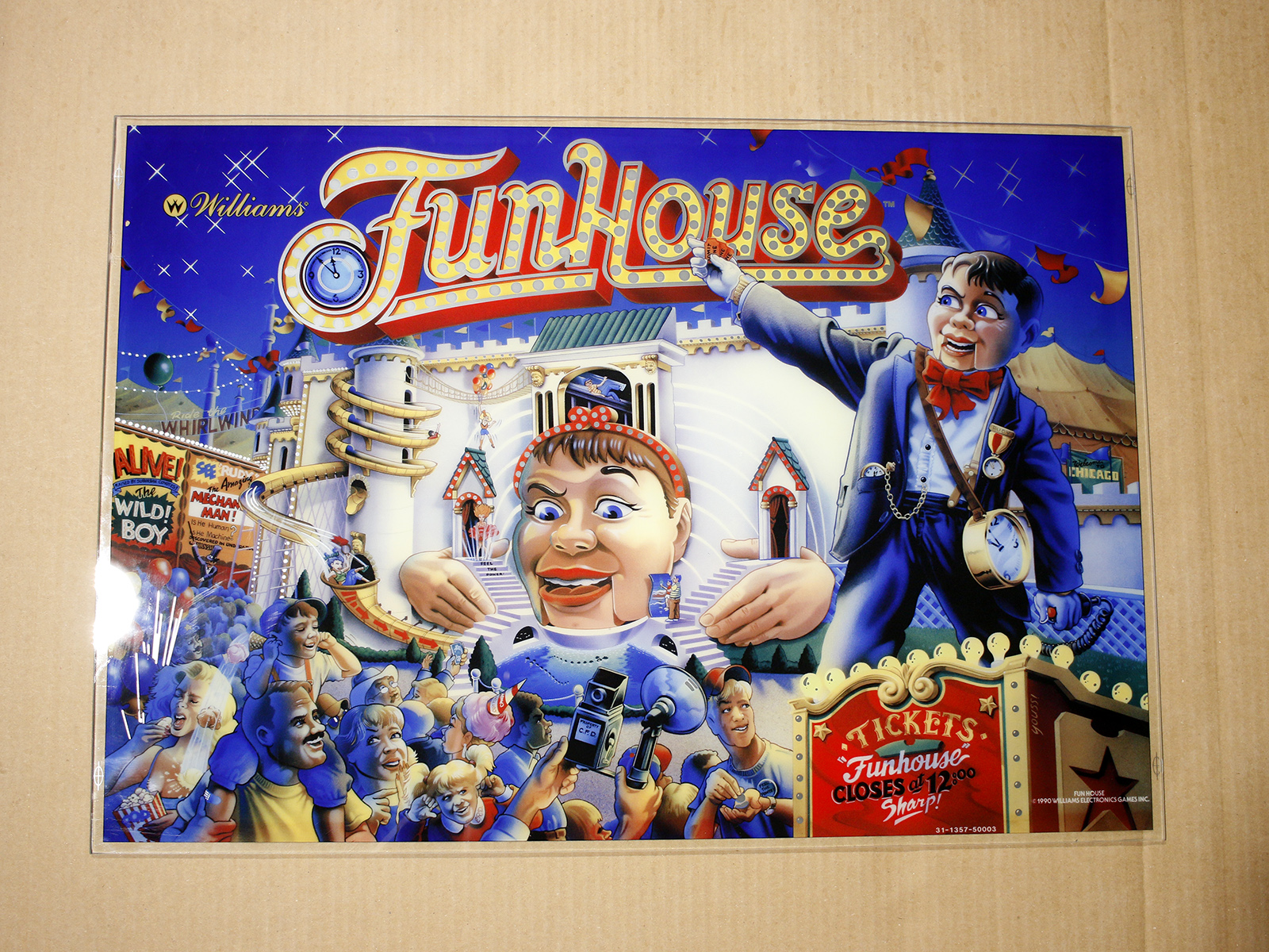 This is a Funhouse mirrored CPR translite-to-backglass that was rejected due to color density being about 10-15% lower than correct. Looks a weeeee bit paler than normal when not backlit, but looks great when backlit. Mirroring is within tolerance. Could be used in a game or as a wall hanger. Priced to clear.