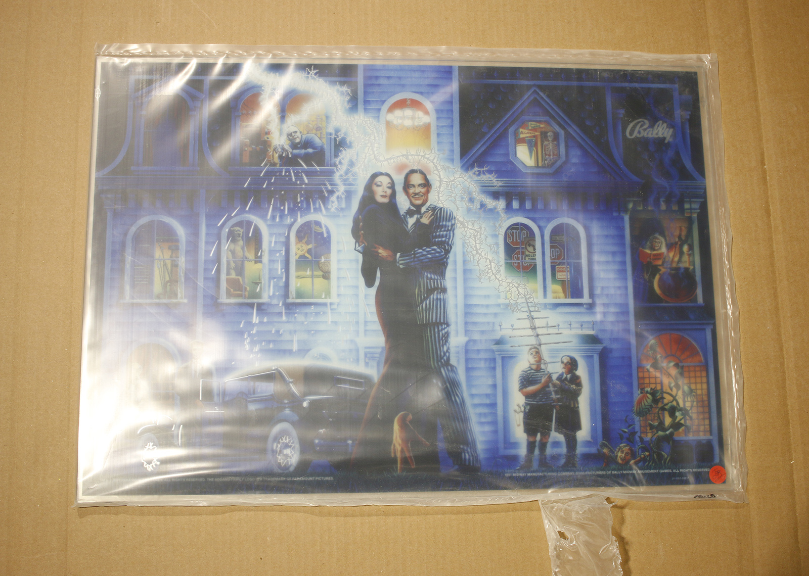 This is an Addams Family Mirrored translite-to-backglass.  It’s still in its 6mil shipping bag, but there is a tear in the plastic.  The glass looks and backlights fantastic, but there is an area of the mirror bits in the “sparks” that are SLIGHTLY off in registration to the artwork.  Everywhere else, the mirror is dead-on.  The only real blem on this glass is a little tiny mirror fleck (from a pinhole in the silkscreen) between their knees.  Photo showing it through the bag.  Priced to clear.  Upgrade your Addams, or put up a sweet wall hanger.