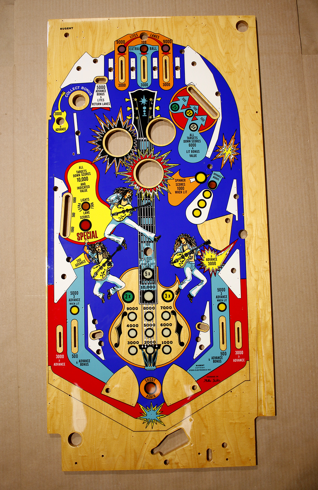 This is a Nugent playfield that was culled to the end, as it was a return from a previous customer who got an exchange. There is a small scratch in the right outlane that didn’t get caught, and it IS under clearcoat. See closeup picture in the gallery. This may invoke a Nugent restoration that is much more affordable on the wallet. Priced to clear.