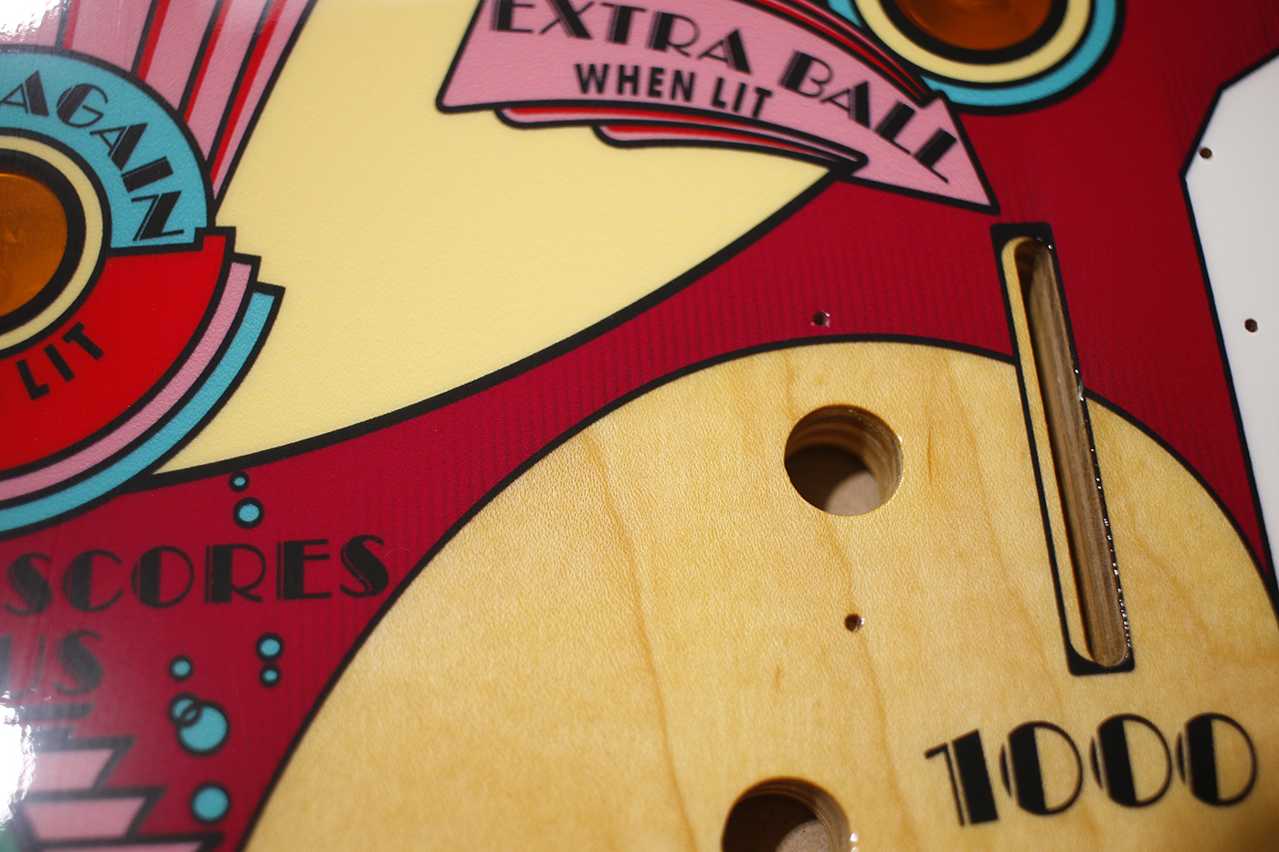 This is an Old Chicago playfield held back for a long time due to small blemishes down near the flippers. Some streaking coming off the lines into the dark rose. The rest of the playfield is fine. Some may see the effect as cool, but we could not sell this as full priced stock. See gallery closeups. Priced to clear.