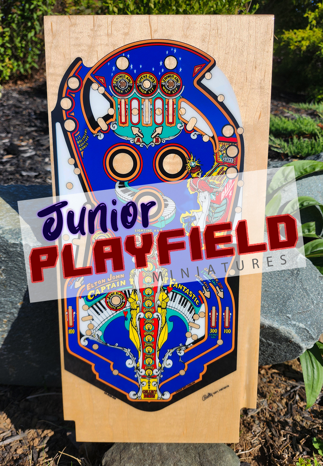 CPR Junior Playfields are miniature playfield wall hangers! These miniatures follow almost the same production path as their big brothers. CNC cut from the same CPR custom gameboard wood stock, with a wee shooter lane included. CPR master artwork and colors, match exactly to full size reproduction playfield prints. 5-layer clearcoated for the exact same finish too! Please check out the photo gallery for examples – sorry, we can’t photograph every title. Try to imagine!
